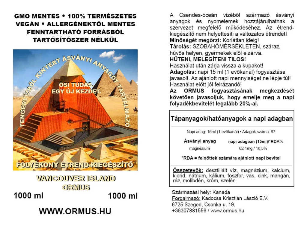 A Vancouver Island Ormus tengervízből kinyert folyékony étrend-kiegészítő alapja 100%-os tiszta óceáni ásványok, amelyeket a kanadai Vancouver-sziget nyugati partjáról nyerünk. Termékünk ásványi anyagokat, nyomelemeket és makro tápanyagokat tartalmaz, amelyek hozzájárulhatnak a szervezetünk megfelelő működéséhez. Az étrend-kiegészítő nem helyettesíti a változatos étrendet!