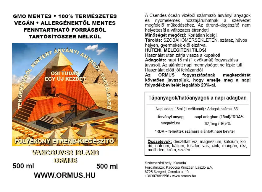 A Vancouver Island Ormus tengervízből kinyert folyékony étrend-kiegészítő alapja 100%-os tiszta óceáni ásványok, amelyeket a kanadai Vancouver-sziget nyugati partjáról nyerünk. Termékünk ásványi anyagokat, nyomelemeket és makro tápanyagokat tartalmaz, amelyek hozzájárulhatnak a szervezetünk megfelelő működéséhez. Az étrend-kiegészítő nem helyettesíti a változatos étrendet!