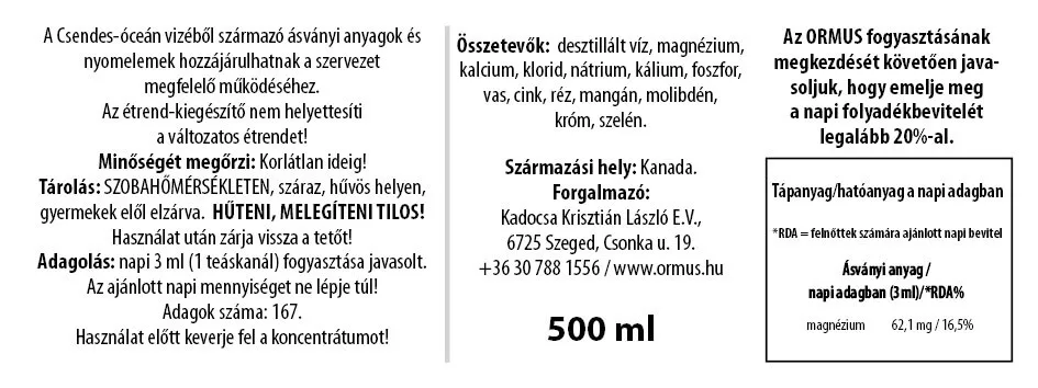 A Vancouver Island Ormus tengervízből kinyert étrend-kiegészítő koncentrátum alapja 100%-os tiszta óceáni ásványok, amelyeket a kanadai Vancouver-sziget nyugati partjáról nyerünk. Termékünk ásványi anyagokat, nyomelemeket és makro tápanyagokat tartalmaz, amelyek hozzájárulhatnak a szervezetünk megfelelő működéséhez. Az étrend-kiegészítő nem helyettesíti a változatos étrendet!
