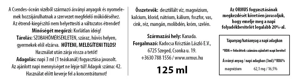 Összetevők: desztillált víz, magnézium, kalcium, klorid, nátrium, kálium, foszfor, vas, cink, mangán, réz, molibdén, króm, szelén