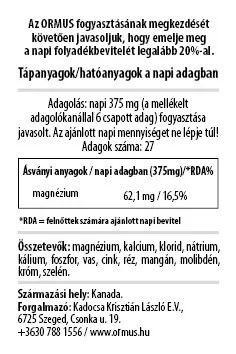 Összetevők: magnézium, kalcium, klorid, nátrium, kálium, foszfor, vas, cink, mangán, réz, molibdén, króm, szelén